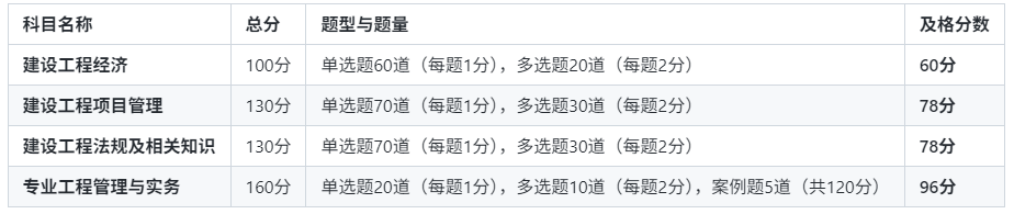 一级建造师考试包含四个科目,各科及格线均为卷面总分的60%,具体分数要求如下: