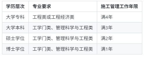 工作年限要求:指从事建设工程项目施工管理工作的年限,不同学历对应年限要求如下: