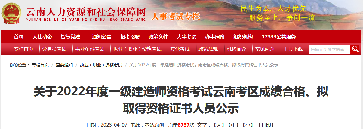 近日,云南人力资源和社会保障网发布了《关于2022年度一级建造师资格考试云南考区成绩合格、拟取得资格证书人员公示》,公示中明确了2022年云南省一建证书登记办理的时间。