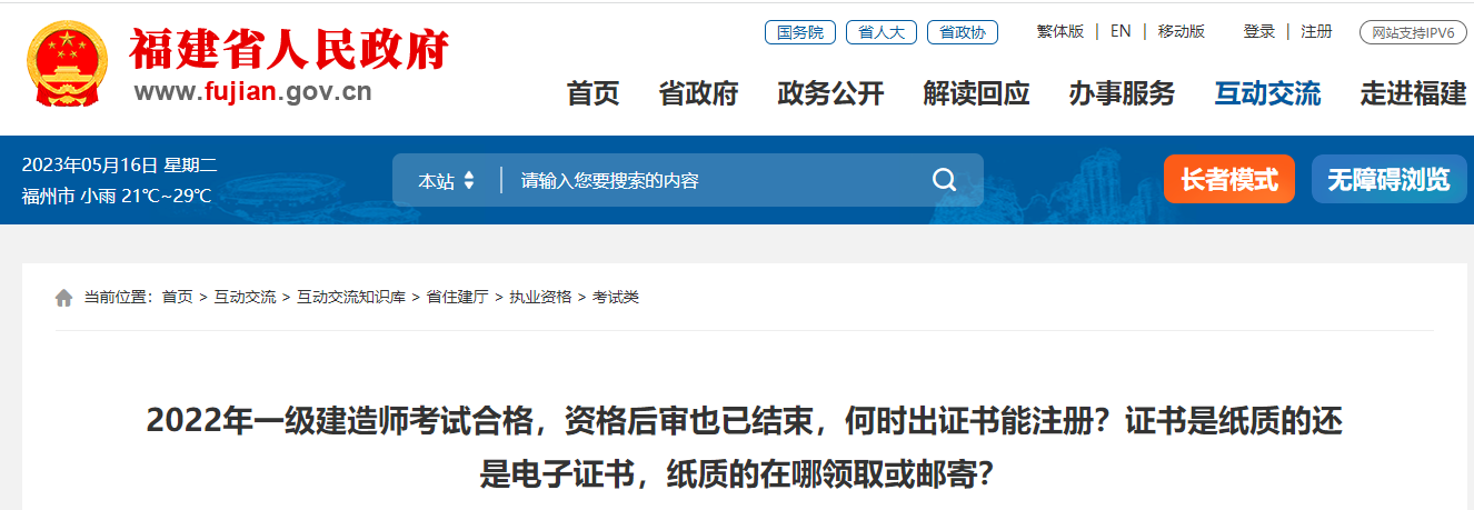 近日,福建省人民政府回答了关于“2022年一级建造师考试合格,资格后审也已结束,何时出证书能注册?证书是纸质的还是电子证书,纸质的在哪领取或邮寄”的问题,明确了2022年福建省一级建造师证书的注册与领取办法。
