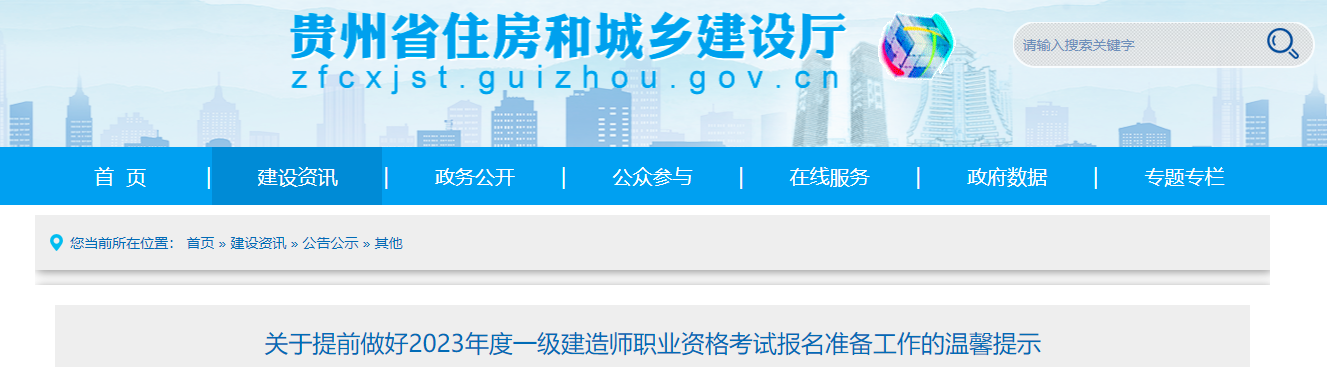 近日,贵州省住房和城乡建设厅发布《关于提前做好2023年度一级建造师职业资格考试报名准备工作的温馨提示》,公告中介绍了2023年贵州省一级建造师考试报名相关的工作安排,公告具体内容如下。