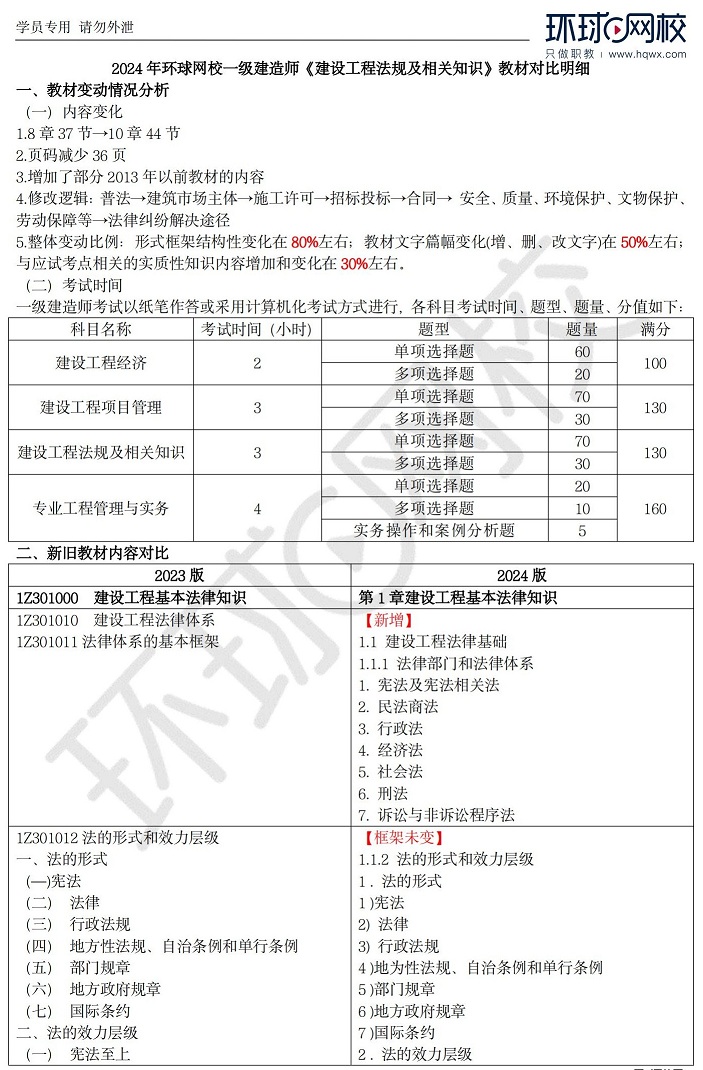 完整版2024一级建造师《建设工程法规及相关知识》教材对比明细下载地址:https://www.hqwx.com/。