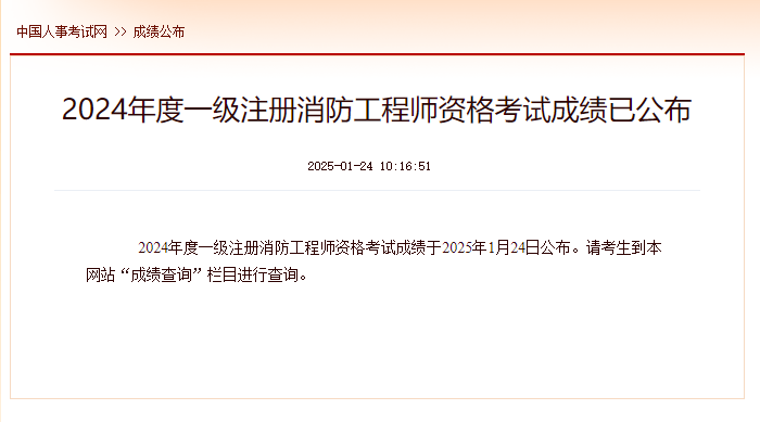 2024年度一级消防工程师成绩2025年1月24日发布,考生需登录“中国人事考试网”(http://www.cpta.com.cn/index.html)查分。