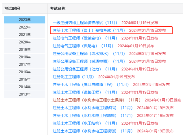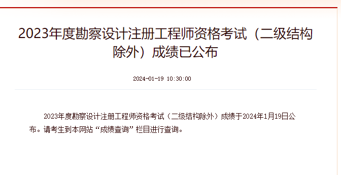 2023年岩土工程师成绩查询入口已开通,成绩查询时间:2024年1月19日10:30起,考生可到中国人事考试网-成绩查询栏目进行查询。