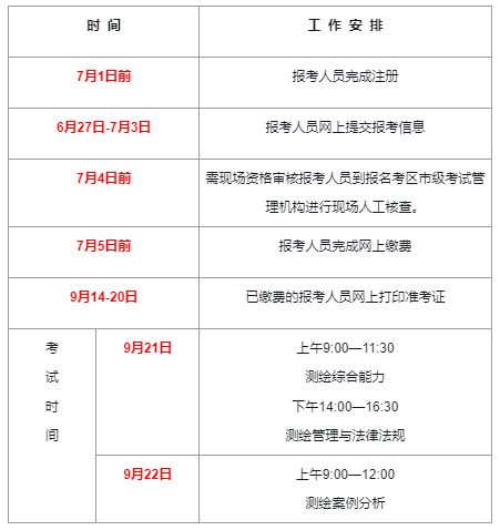 6月23日,根据河北省人事考试网发布的《关于做好2024年度注册测绘师职业资格考试考务工作的通知(摘要)》,其中明确了2024年河北注册测绘师报名时间为6月27日-7月3日;现场人工核查时间为7月4日前;网上缴费截止时间为7月5日前;准考证打印时间为9月14-20日。
