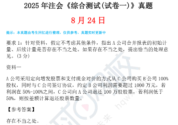 2025年注册会计师考试顺利结束了,综合阶段真题及答案已出炉,本站编辑根据考生回忆整理了卷一答案,速来估分!