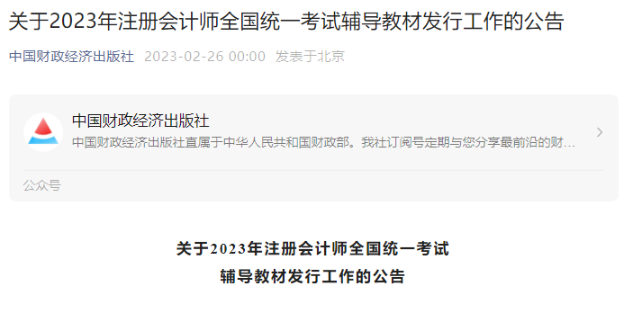注册会计师考试教材出版社是中国财经出版传媒集团,近日中国财经出版传媒集团网站发布了《关于2023年注册会计师全国统一考试辅导教材发行工作的公告》,明确了2023注册会计师考试教材预计2月底发行,预计3月2日发货。