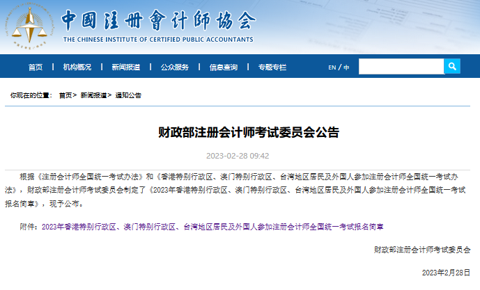 通知关于2023年香港特别行政区、澳门特别行政区、台湾地区居民及外国人参加注册会计师全国统一考试报名简章内容如下: