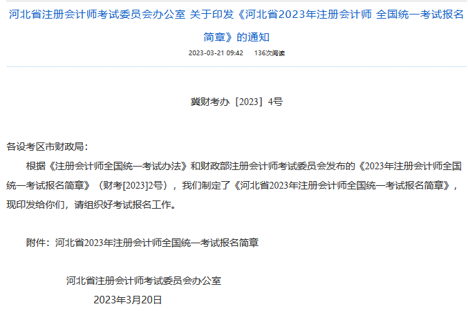通知中2023年河北省注册会计师考试报名简章内容如下: