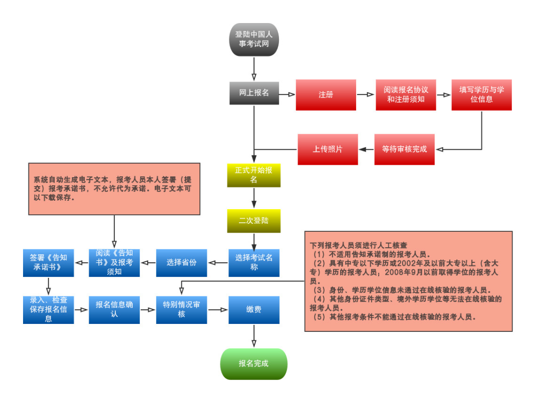 报名流程包括注册账号、填写个人信息、上传照片、选择考试科目、签署承诺书及完成缴费等步骤。首次报考者需通过中国人事考试网(http://www.cpta.com.cn/)注册账号,并上传符合要求的证件照。系统将对考生身份和学历信息进行在线核验,若无法通过核验,需提交人工审核材料。建议考生提前完成注册和信息完善,确保账号信息完整度达100%,避免因系统拥堵或审核问题影响报名进度。