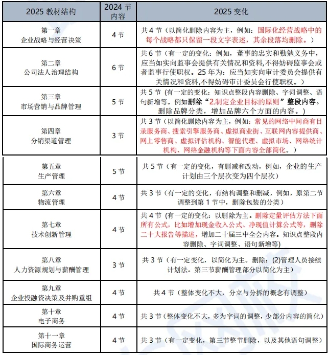 2025年中级经济师工商管理教材的变动对考试的影响主要体现在以下几个方面: