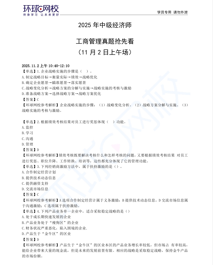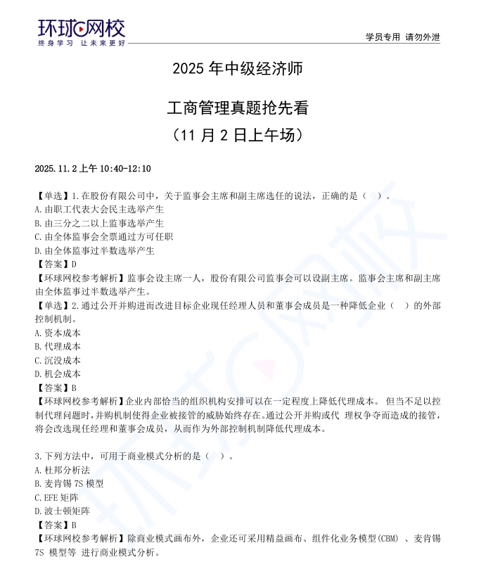 2025年中级经济师11月2日上午场工商真题及答案已经出来了,经环球网校教研老师整理,本文特分享给小伙伴,大家可据此预估分数!