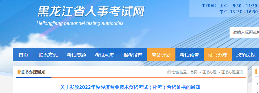 2022年黑龙江中级经济师补考合格证书领取的原公告如下