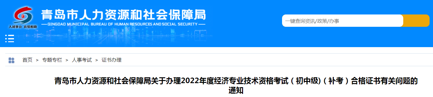 青岛市人力资源和社会保障局关于办理2022年度经济专业技术资格考试(初中级)(补考)合格证书有关问题的通知