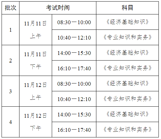 初中级经济考试分2天,上、下午共4个批次实施。各级别及专业类别的具体批次划分和考试时间,视报名情况另行确定。