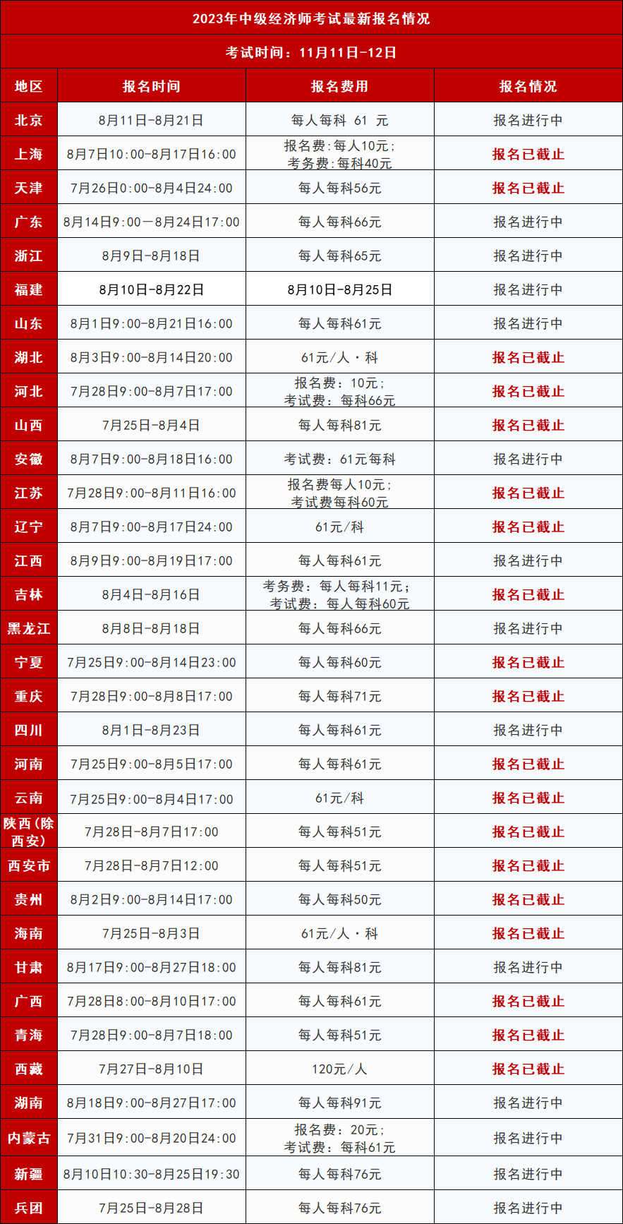 为了方便大家了解报名情况,我们特地整理了2023年全国各省中级经济师考试报名时间及报名费用汇总。具体的报名时间和费用请参考各地考试管理部门发布的公告,或者关注我们的网站,我们将第一时间更新相关信息。