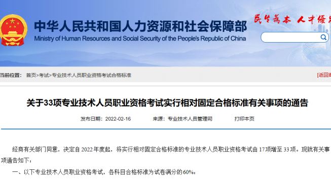 近日,人社部网发布了《关于33项专业技术人员资格考试实行相对固定合格标准有关事项的通知》,通知里明确了中级会计考试各科目合格标准:各科目合格标准为试卷满分的60%,建议考生及时了解,通知中与分数线相关的原文如下:
