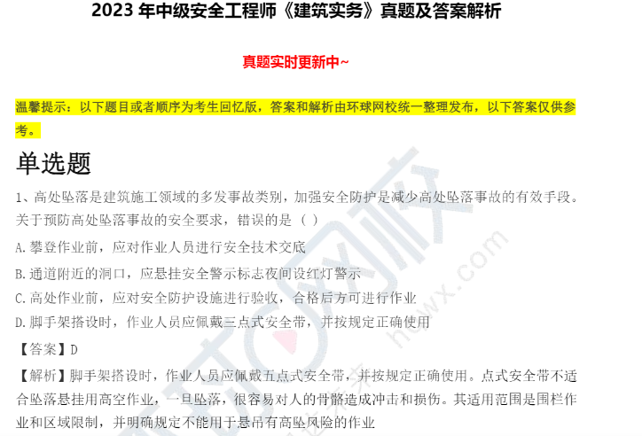 以上为2023年中安考试《建筑施工安全》部分真题及答案解析,完整版2023年中级注册安全工程师考试考情分析可以通过以下方式获取: