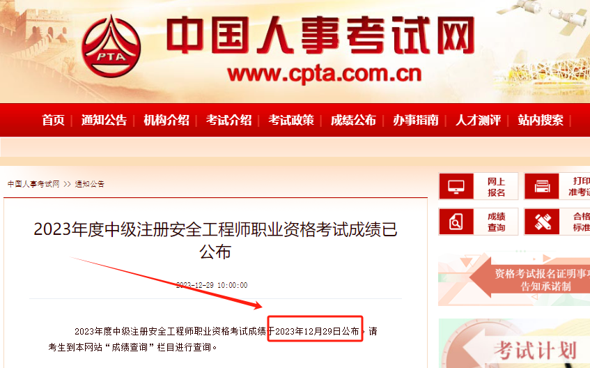 从中国人事考试网发布的通知中得知2023年中级注册安全工程师职业资格考试成绩于2023年12月29日公布,大家进入中国人事考试网中的“全国专业技术人员资格考试报名服务平台”,输入个人信息即可查分。建议点击文章顶部免费预约“考试小秘书”,届时会短信通知大家2023年中级注册安全工程师证书领取等重要信息!