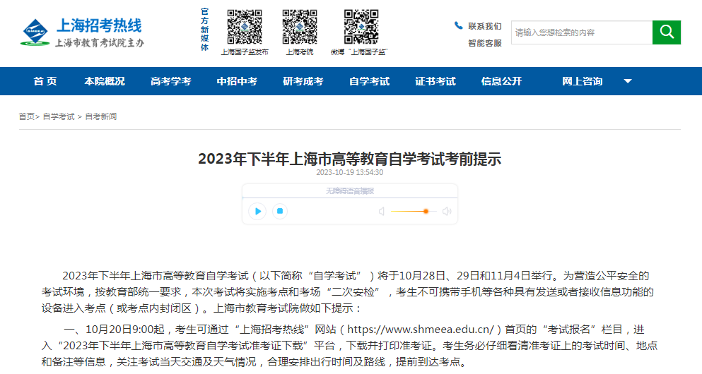近日,上海教育考试院发布了《2023年下半年上海市高等教育自学考试考前提示》。根据该公告,2023年10月份上海自学考试准考证打印开始时间为2023年10月20日9:00。