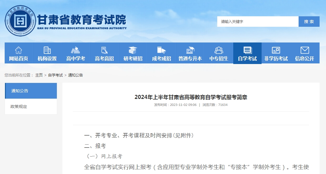 近日,甘肃省教育考试院发布《2024年上半年甘肃省高等教育自学考试报考简章》,依据该简章可知,该省2024年4自学考试成绩查询时间:考后一个月。