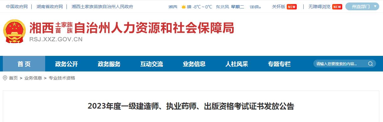 2024年1月22日,湘西自治州人力资源和社会保障局发布了《2023年度一级建造师、执业药师、出版资格考试证书发放公告》,对2023年湖南湘西自治州执业药师资格证书领取时间和方式作出了具体说明。