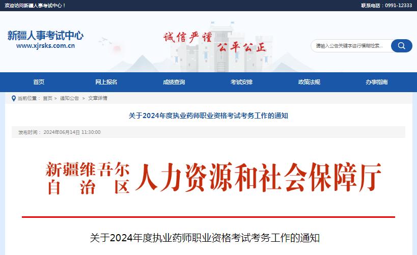 2024年6月14日新疆维吾尔自治区人力资源和社会保障厅发布了《关于2024年度执业药师职业资格考试考务工作的通知》,从中得知,2024年新疆执业药师资格考试报名时间为6月25日至7月9日。