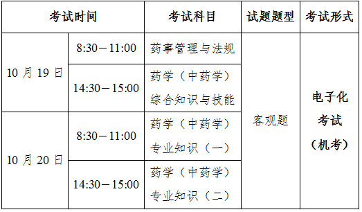 注:1.考试设药学类、中药学类两个专业类别,每个专业类别均包括4个考试科目;2.“药事管理与法规”为药学类和中药学类共同考试科目。