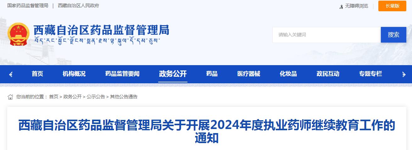 近日,西藏自治区药品监督管理局发布了《西藏自治区药品监督管理局关于开展2024年度执业药师继续教育工作的通知》,从中得知,2024年西藏执业药师继续教育时间为2024年8月8日-2025年3月31日,在西藏自治区内注册的执业药师以及在西藏自治区内报名考试取得执业药师资格,尚未注册的执业药师,均可免费报名学习。
